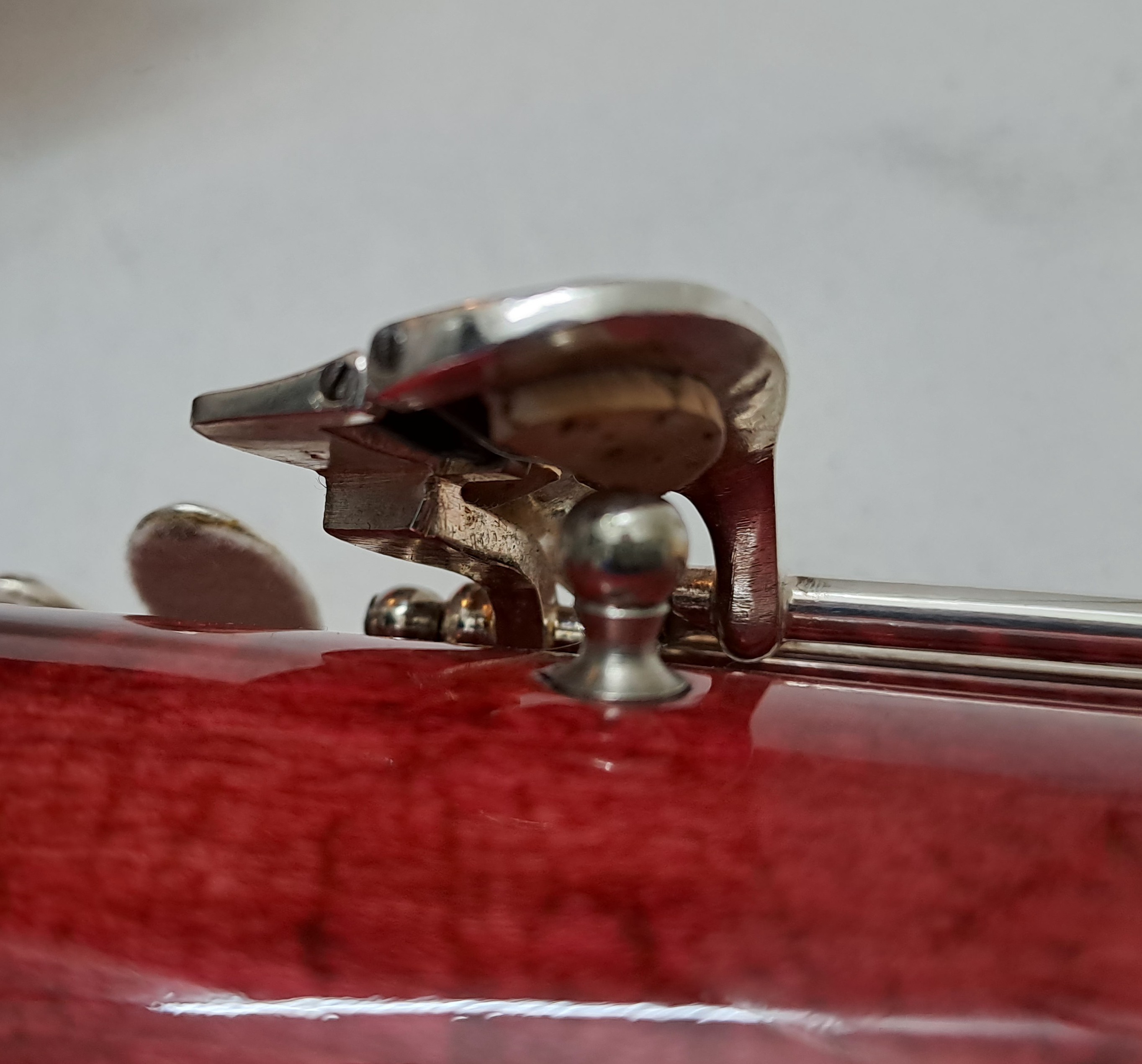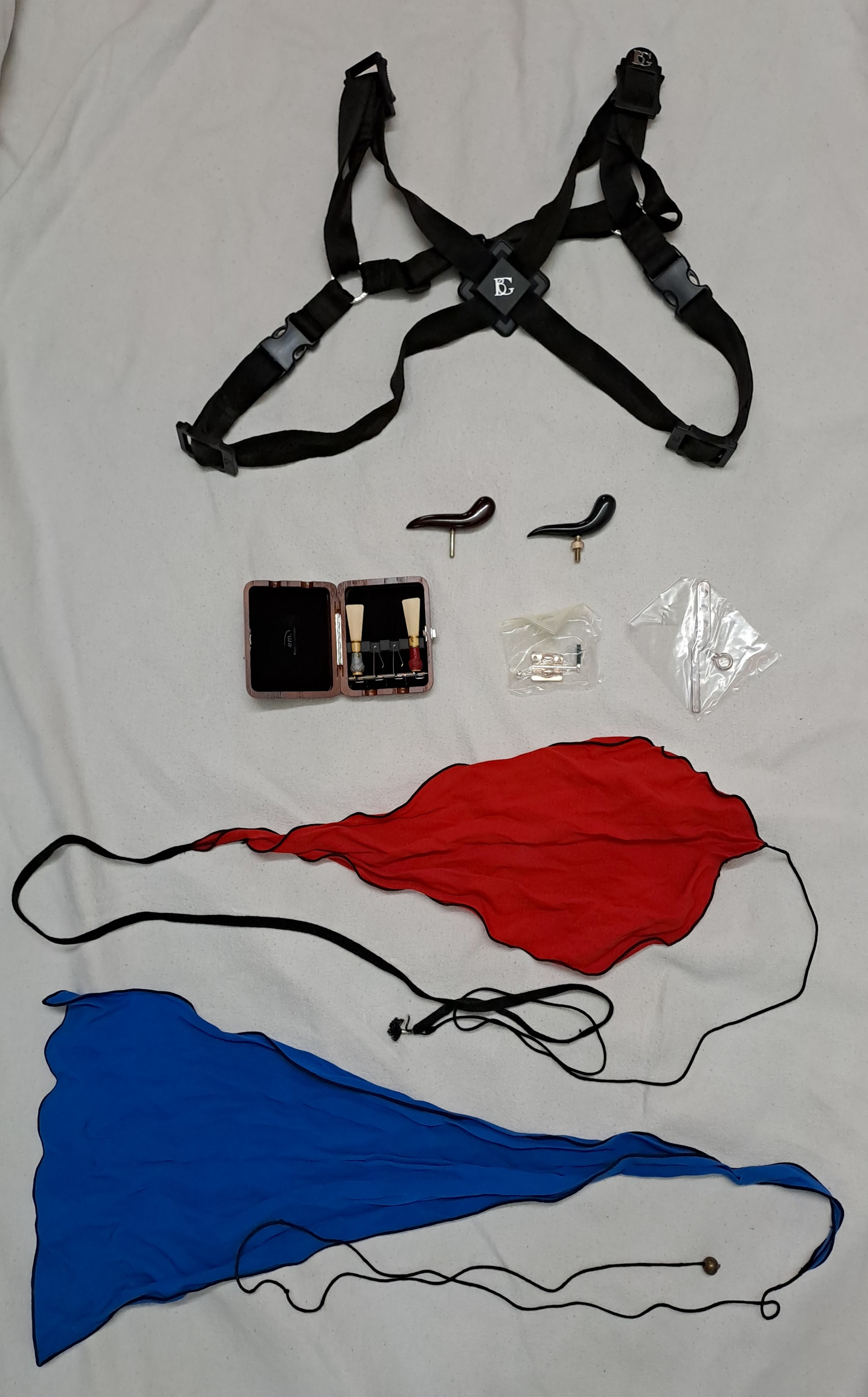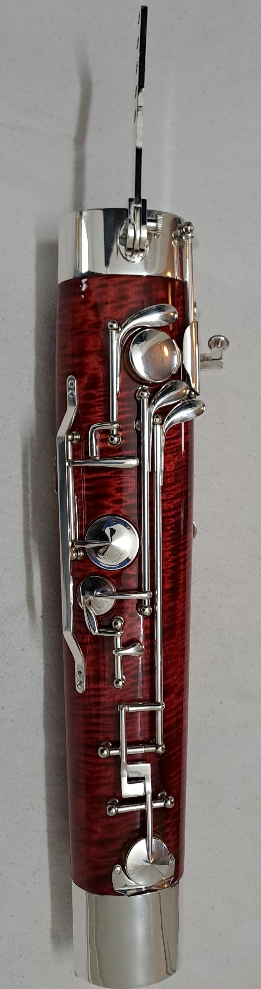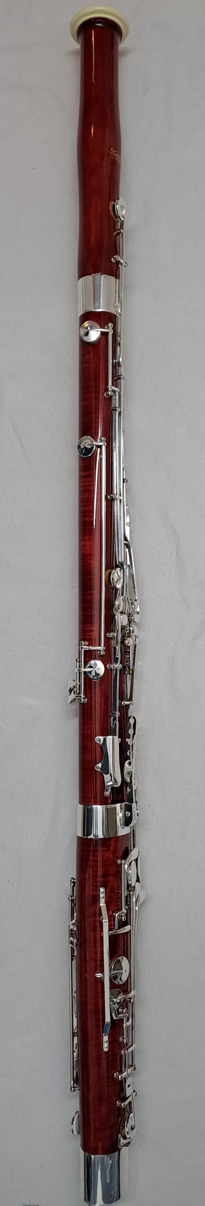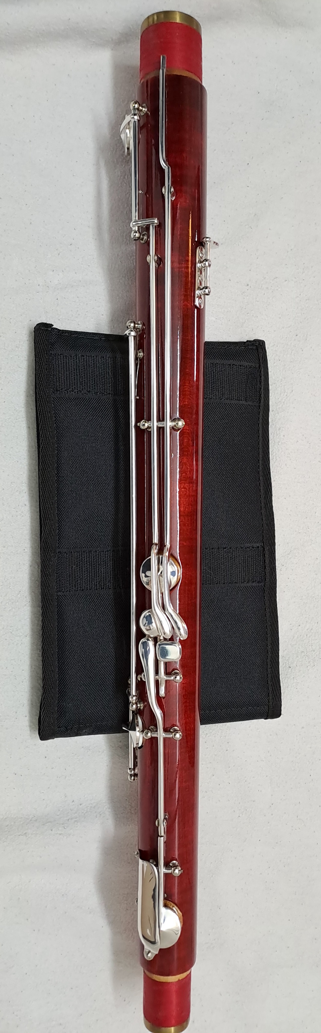 Folgendes Zubehör kann auf Wunsch kostenfrei beigelegt werden: Ein kleinerer Balancehalter sowie Ersatzteile für den Flügel-Bassstangen-Riegel. Zwei unbespielte Doppelblattrohre im Holzetui (Stärke F2, erstanden 2025). Stiefel und Flügel Putztuch, Schulter-Tragegurt von BG France, Korkfett von La Tromba sowie 2 Daumenstützen. Auf Anfrage sende ich gerne weitere Detailfotos des Instruments sowie der Originalrechnung.