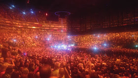 Alles scheint wieder einmal eine Nummer zu groß. Die Leinwand, die Bühne(n), die sich durch die ganze Halle erstreckt, enorme Licht-und Bühneninstallationen hängen unter dem kompletten Hallendach in nicht zählbarem Ausmaß.