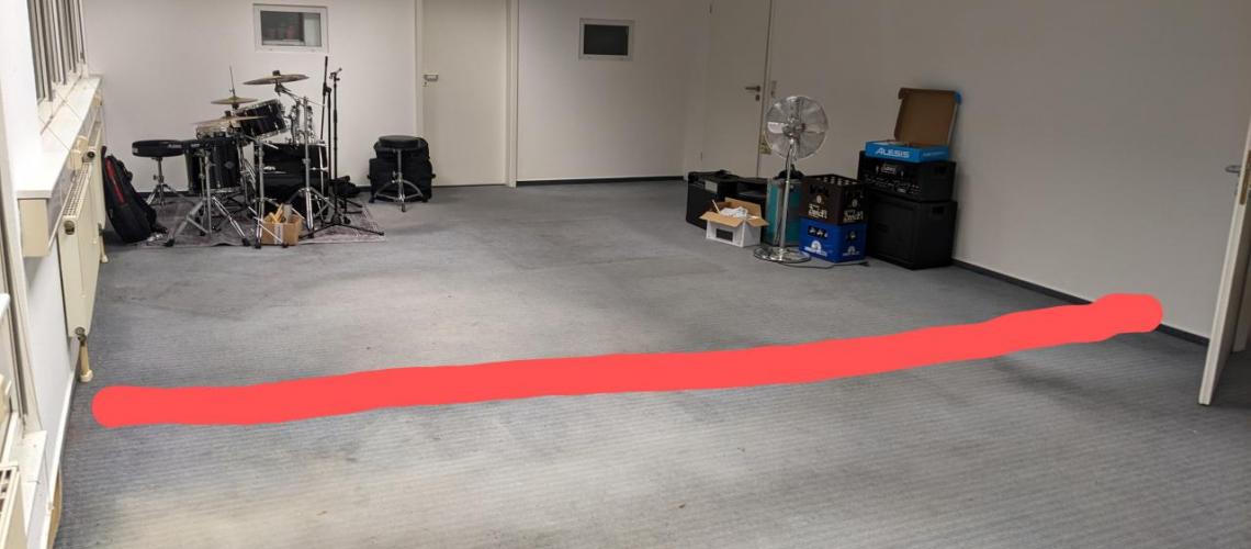 Der Raum ist der mit dem Schlagzeug...nicht der komplette Raum auf dem Bild. An der Roten Linie wird noch eine Wand eingezogen!
