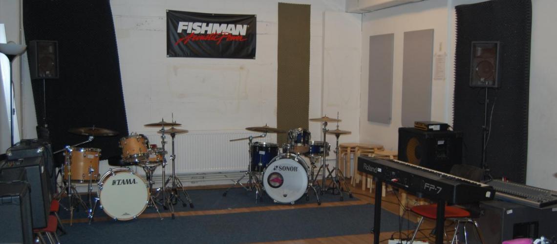 Einrichtung: Gitarren-Amp x2, Bass-Amp x2, Digitalpiano: Roland FP-7, Drumset x2, PA, Stühle, Mikrofon- und Notenständer