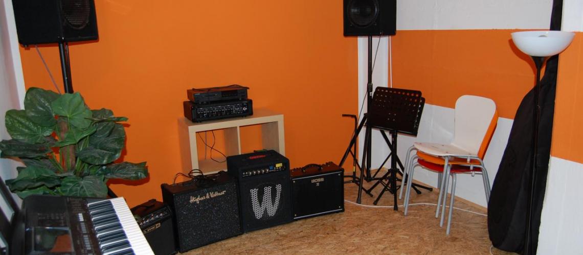Einrichtung: Gitarren-Amp x3, Bass-Amp x1, Digitalpiano: Yamaha Clavinova, Kompakt PA, Stühle, Noten- & Gitarrenständer
